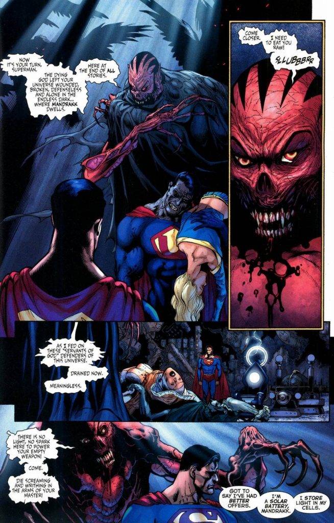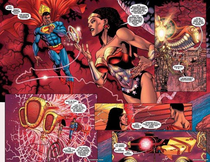 En principio quiero dar un punto de vista más personal al respecto: el mayor error de DC fue vender este título como un evento, como una típica crisis de DC.Porque no hay nada más alejado de esto. Final Crisis es una parte de las tantas que forman la obra completa de Grant Morrison en DC desde que volvió a Batman con Batman and Son. Batman, Seven Soldiers, Final Crisis, The Return of Bruce Wayne, Multiversity… todo forma parte de una gran idea de Morrison segmentada. Final Crisis y sus consecuencias son principalmente una repercusión y necesidad en el título de Batman, de acá a años. Si en la JLA empezó la idea de Batman como una suerte de dios imbatible y preparado para todo, acá ya lo vemos jugar mano a mano contra uno, y destruir su juramento tras descubrir el asesinato de Orion. Probablemente una de las páginas más espectaculares de DC en general sea esa Sanción Omega. También es la excusa para traer a Barry, quien al encontrarse con Iris se disculpa por “llegar tarde”, como siempre pasó en la Silver Age, el tipo súper veloz que nunca llegaba a tiempo. Porque de esto también se trata la crisis, de traer conceptos viejos y renovarlos. Para explicar por qué Superman es Superman y solo él puede salvar el día (o sólo ellos, ustedes entenderán). Porque si hay una máquina milagrosa en algún lugar del universo, solamente la esperanza encarnada puede encontrarla y ponerla en marcha. ¿Hay algo más increible que esa alineación de 52 tierras? No Sr. Presidente, seguramente no.