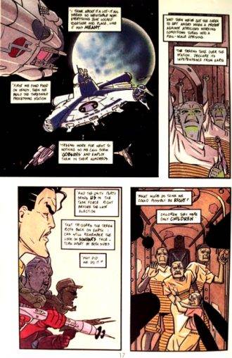Sobre el final, Morrison sube la apuesta: en un thriller crepuscular, sórdido, de fuerte contenido sociopolítico, irrumpe un clásico villano alienígena, eterno enemigo de Dan Dare. Y si bien el rol del Mekon en esta conspiración está bien justificado, su aparición le agrega a la historia un elemento casi más bizarro que fantástico, sin el cual el resultado final sería un poquito más consistente. De todos modos, estamos ante una excelente historieta, con un clima opresivo, dilemas éticos, replanteos a fondo y –en las últimas páginas- un cambio radical en el status quo del que ningún otro guionista se va a hacer cargo jamás.