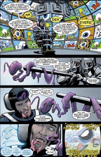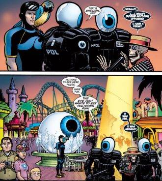 El tono cambia en la segunda parte cuando el ritmo desenfrenado y el humor ácido dan lugar a una historia de superhéroes donde esa conspiración subyacente en la narrativa se vuelve evidente y pasa a ocupar el eje de la historia. Ahora hay un enemigo tangible que no duda en matar con total frialdad y un peligro aún más tangible a los que se tienen que enfrentar los héroes. Por otro lado, el peso y rol de los Mickey Eye, que ya eran escabrosos en la primera parte, toma mayor peso como grandes artífices de la conspiración y control de la población. En este sentido, la metáfora no es elaborada ni sutil. Es una crítica muy frontal a la sociedad actual en la que los autores dejan plasmada su mirada.