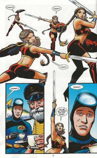 Un poco por casualidad, o un poco por el destino, se cumple su deseo de vivir aventuras –aunque no sea muy consciente de lo que esto conlleva- para convertirse en un héroe y así She-beard se entera de que existe. Así termina enfrentando a villanos en altamar, luego viaja a la Atlántida y finalmente a la luna. En cada una de estas secciones, el guionista y su cómplice ideal para este comic – el dibujante Cameron Stewart- hacen un gran despliegue de una imaginación desbordada. Logran un mix donde imprimen su personalidad a los tópicos de los clásicos de aventuras, con vueltas de tuerca en donde el tono paródico los salva de caer en una narrativa rebuscada. Para que se den una idea, es una suerte de Elige tu Propia Aventura a lo Morrison.