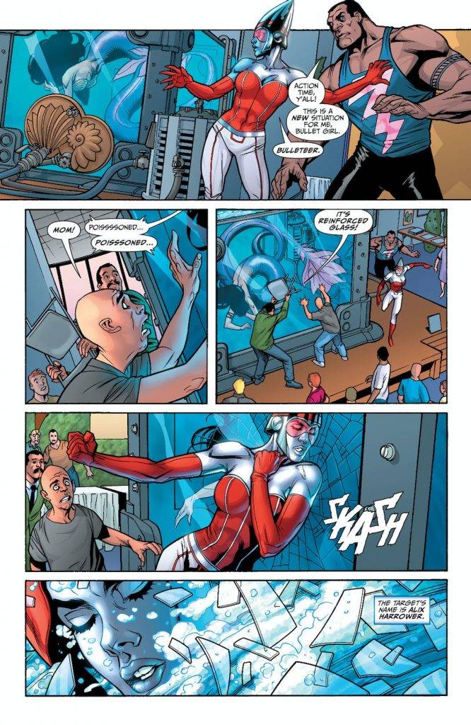 The Bulleteer es una deconstrucción del mundo superheroico, bella y trágicamente contada. La protagonista es Alix Harrower, con la que Morrison jugará para criticar, satirizar y hasta evidenciar problemáticas tanto reales en el mundo del comiquero, como en el mundo de un superhéroe que no pidió sus poderes. Porque Alix es un personaje trágico. Sus poderes son por accidente, no quiere destacar, no quería tener un marido con fetiche por superhéroes, no quería ser cornuda, ni cosificada, ni apurar filas en eventos de comics mostrando el escote. Alix tenía un empleo al que no va a poder volver, tampoco pide ser sexualizada ni quiere destacar, no quiere ser única en un mundo donde ser único es lo que te hace ser protagonista. Toda esta incomodidad es excelentemente retratada por Yannick Paquette, que nos muestra siempre a un personaje que pareciera incómodo con su propia ropa (y en más de una ocasión, innecesariamente en ropa interior, para cerrar el círculo). Bulleteer es quizás la mini con más crítica a la actualidad que se vivía (y vive) y en el que más se profundiza el lado oscuro del superhéroe.