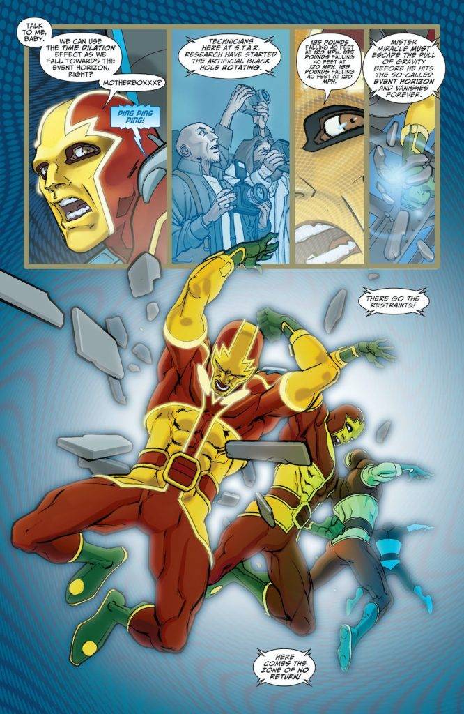 Así como se ha festejado hasta el hartazgo (y me incluyo) la idea de Tom King de encerrar a Mister Miracle en un mundo donde puede huir solamente muriendo (aparentemente), acá Morrison nos plantea a un Shilo atrapado en la trampa de la vida, donde la forma de escapar es vivir una vida sin sentido. Es la Omega Sanction que vamos a conocer: vivir sin un propósito y esperar a que todo termine. Seguramente los fans de Batman podrán rascar más el fondo de la olla con esta idea, que alguien que no haya seguido toda la odisea Morrisoneana desde Batman and Son hasta Batman Inc. (que formarían tranquilamente una gran historia repartida en diversos títulos y personajes). La proto idea del Hyper-adaptor que persigue a Shilo, un espíritu libre, sólo le dará caza si lo encierra.