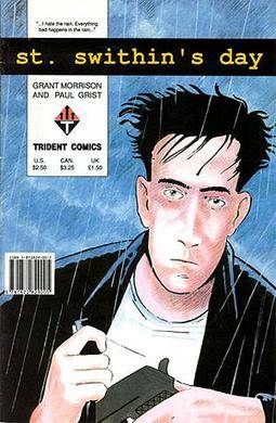 St. Swithin´s Day es una historieta de apenas 24 páginas, que originalmente apareció serializada en 1989, en la efímera (pero excelente) revista británica Trident. En 1990, Trident la recopiló en una revistita a todo color (la serialización fue en blanco y negro), pero con una tirada bajísima, que se agotó muy rápido. Al año siguiente, la editorial se fundió, y nunca más se reeditó este material en el Reino Unido. Por suerte en 1998 apareció la editorial estadounidense Oni Press, que la reeditó en blanco y negro, y con una tirada más grande (es lógico, para 1998 Morrison ya era una mega-estrella a ambos lados del Atlántico), que en su momento se conseguía bastante fácil. ¿Por qué no se reeditó a todo color? Aparentemente porque las guías de color, realizadas por Steve Whitaker, se perdieron cuando cerró la editorial Trident.