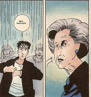 El grueso del comic consiste en meternos en la cabeza del protagonista, y ver de cerca sus rayes, sus obsesiones y esa angustia adolescente con la que tanto nos identificamos si leemos esta historieta en nuestros años mozos. Leído de adulto, el comic es un toque demasiado obvio: Ya en la primera secuencia, cuando el pibe se punguea un ejemplar de Catcher in the Rye, Morrison empieza el derrape hacia un cliché medio grotesco, que se termina de consumar cuand el protagonista se escribe en la frente las palabras «neurotic boy outsider». Por otro lado, leído hoy en Argentina, un comic cuya premisa es «odio a esa líder política entonces le voy a pegar un tiro, pero finalmente eso no sucede» se siente demasiado cercano, demasiado real y demasiado aberrante. De todos modos me copa el final: el pibe en vez de pelar un chumbo y matar a Thatcher, le hace «bang» con los deditos en forma de pistola. Los custodios lo recontra cagan a trompadas, pero el pibe igual siente que todo valió la pena por el cagazo que se pegó esa vieja turra. El imbécil que trató de matar a Cristina ni siquiera siente eso, porque CFK se dio cuenta de que le dispararon cuando el peligro ya había pasado. Ah, y el juego de palabras entre Rambo y Rimbaud también está muy logrado.