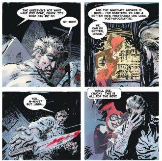 “Crazy for you”, de Bryan Smith & Brian Keene y el crack de Kyle Baker. El relato nos muestra a hombre con un cuchillo ensangrentado en la mano tras haber asesinado a su mujer. No sabe qué paso hasta que se le aparece en modo fantasma Harley Quinn y entendemos que es un esquizofrénico. Las voces de Harley lo impulsan a cometer actos violentos. Ajá, entendí el chiste. Podría ser Harley Quinn como el Pato Lucas. No hay una real justificación más allá de que Harley tenga que aparecer por lo popular del personaje. Al menos tenemos el dibujo de Kyle Baker, que siempre la rompe.