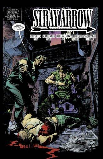 “Stray Arrow”, Ronald Malfi y Dale Eaglesham. Acá Gren Arrow es un asesino y tiene a Black Canary secuestrada. Esta historia tiene una vueltita de tuerca al final al estilo Cuentos de la Cripta. Nuevamente una mirada distinta de personajes ya establecidos en una versión oscura que no termina de convencer.