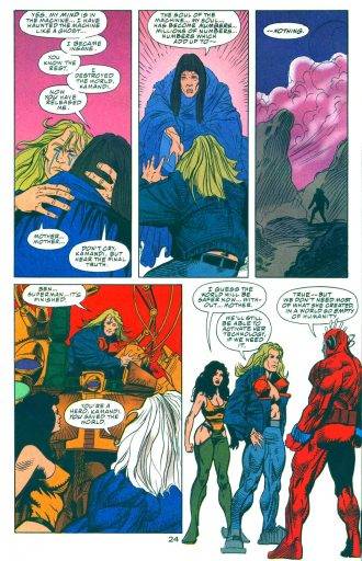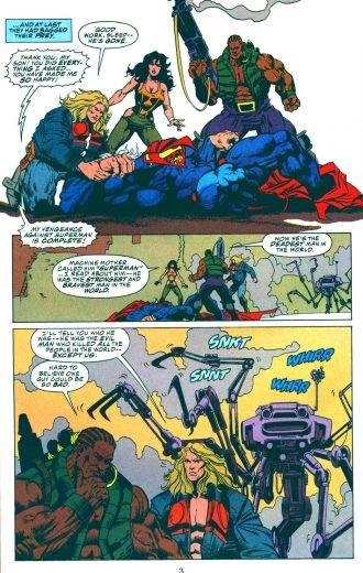¡Pero, esperen, no está todo dicho! Aparece la verdadera Madre, que estaba atrapada dentro del sistema y resulta ser la madre de Kamandi que fue corrompida por la computadora. El que diseñó todo fue el padre, que metió el cerebro de su madre en la computadora y esto la mató. ¿Qué? ¡Basta para mi, basta para todos! No puedo más de esta verdura cósmica. Para finalizar, te cuento que nuestros amigos se separan, Kamandi se queda con Shappira, Sleeper se raja a hacer de las suyas y Superman se va en rumbo a Gotham con unos terribles chumbos gigantes para protagonizar su propia miniseria titulada “Superman: At Earth`s End”. No puedo esperar para reseñarla. ¡Qué hijos de mil! Me quemaron el cerebro con esa verdura.