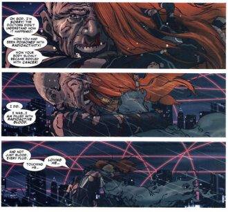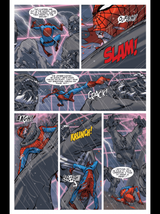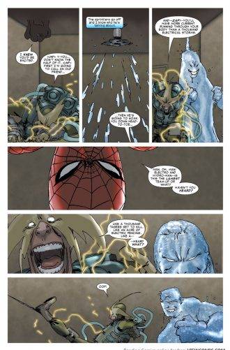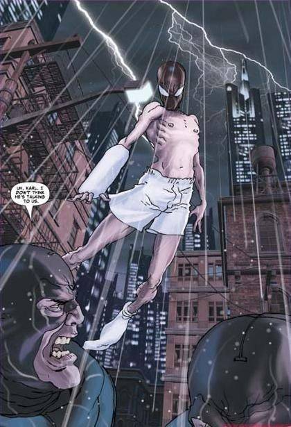 Ahí J.J. blanquea que sabía que él era héroe arácnido, y le pide que vuelva, que la ciudad lo necesita, si puede contar con él, a lo cual Spidey le responde con un puñetazo donde da entender de que volverá. Todo dicho. ¡STOP! Usted está a punto de entrar en la zona verduleril, si continua es bajo su responsabilidad. Este primer número tenía todo para ganar. Uno dice no puede fallar. Pero a medida que “Reign” avanza, se empieza a caer a pedazos. No puedo creer cómo pasamos de un 10 a un 1. ¿Qué te pasó Andrews? Todo funcionaba bien mientras copiabas al DKR de Miller? Empezaste a construir tu propia historia y terminó todo en un precipicio…