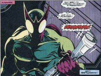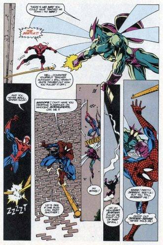 El que lo inculpa es el Beetle (¿lo qué?). Sí, un villano bastante de la B, al que pocos recuerdan. Este villano había tenía un encuentro reciente con nuestro amistoso héroe junto con otros villanos en la olvidable miniserie “Lethal foes of Spider-Man” y el muy turro quedó con la sangre en el ojo. El criminal muerto por la telaraña trabajaba para él y por una cagada a pedos del villano el malhechor murió de un paro cardiaco. Este hecho le vino como anilló al dedo al Beetle, que se la pasaba persiguiendo a Spidey para poderlo cagar con alguna cosa. Y justo el chorro que se escapa de la telaraña en la cual había quedado prisionero, se muere de un paro cardíaco causado por el Beetle. Qué increíbles casualidades, ¿no? El turro del villano replica la telaraña y lo deja al malhechor fiambre para que lo encuentre la policía. Pobre Spidey, menos mal que pudo resolver el misterio y limpiar su nombre. Porque si no… otro muerto más para echarse la culpa además de Tio Ben y Gwen Stacy. ¡Peter, Peter que héroe sufrido sos, carajo!