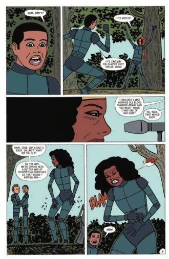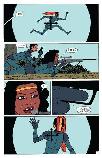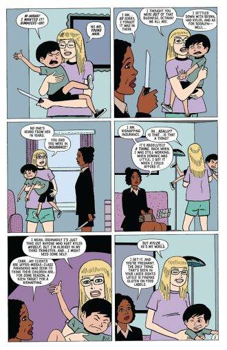 Hasta ahí, la cosa Kill Billesca (de hecho las chicas son una negra, una rubia y una asiática). ¿Y lo Anderseano? Está en cómo Tini elige contar las cosas. La acción tiene una pata preponderante en la historia, pero al final del día lo que vemos es la historia de un grupo de chicas que vienen de un lugar difícil y tratan de hacer lo posible para encajar en la sociedad. Las tres arrastran un “trauma” con respecto a la idea de ser madres con un pasado de asesinas a sueldo. Un dato curioso: esta historia se le ocurrió a Howard cuando se enteró que su mamá tenía un “seguro de secuestro”, debido a que su padre (el abuelo de Tini) era un agente de alto rango en la CIA, y si bien nunca les pasó nada, el riesgo latente estaba. La idea le quedó boyando a la guionista el tiempo suficiente como para usarla de cero en una historia sobre relaciones entre asesinas, gente que uno creería que es más fría y calculadora y menos sentimental. En los comentarios del tomo recopilatorio, Tini siente que ella y su mamá no son como Octavia y Dominic (el hijo de Octavia y Carlos), aunque siente que su profesión como escritora freelancer es de tanto riesgo como ser una asesina. Chistes aparte, para ella la gracia está en que “el peligro real nos hace anhelar la normalidad del mismo modo que la normalidad nos hace anhelar la aventura.”. Así como su mamá y ella tuvieron una vida normal, Octavia y Dominic no la van a tener.