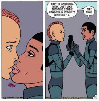 Hablando de tiroteos, Beto Hernandez: la parte más grossa de su corpus, como sabemos, está en Palomar, con historias más reflexivas y contemplativas que con acción. Y si bien hablamos acá de sus momentos artísticos más agitados, hay que volver a destacar lo mismo: lo bien que están hechas las escenas de acción, los tiroteos. Gilbert, al igual que Jack Kirby, opta por combates más estáticos, sin líneas cinéticas, donde todo es más posado, en lugar de un movimiento continuo imaginado por el efecto del arte secuencial. Si bien su dibujo no es tán logrado como en el pasado, acá tiene todas las pilas puestas, ayudado por el color de Rob Davis.