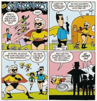 Para hacerle la segunda, Beto reclutó a sus hermanos, Jaime y Mario. El primero participó de los nºs 2, 3, 4, 5 y 8, con una historieta de superhéroes en joda, titulada (en castellano) «Los Super Sónicos». En el nº5 aportó también una breve historia centrada en una versión «alternativa» de Papá Noel. Algunas de estas historietas son muy cortitas, de hecho alguna vez Los Super Sónicos ocuparon solo la contratapa de Measles (lo cual está bueno, porque los pudimos ver a todo color). Mario, por su parte, aportó historias cortas (sin personajes recurrentes) a los números 1 al 4 y 6, y estoy en condiciones de afirmar que fue lo mejor que dibujó en su vida. Ojalá hubiera continuado haciendo historietas en ese estilo.
