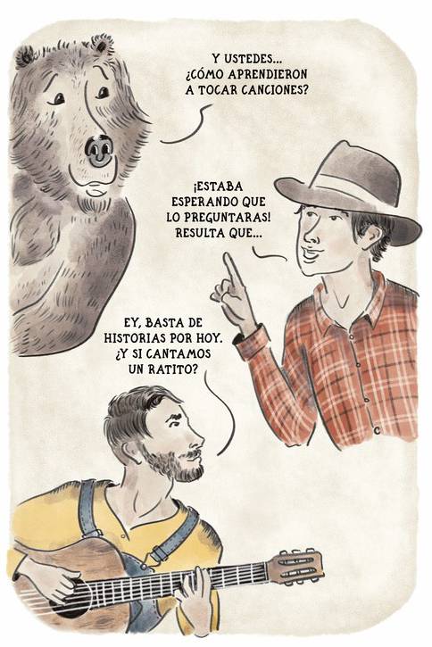 Este año, en el marco del FAH, Jano hizo una presentación con su guitarra en la que relataba la historia mientras tocaba las canciones compuestas para la obra. Fue hermoso: el lugar estaba lleno de infancias completamente entregadas al relato, y lo mismo nos pasó a los adultos que estábamos ahí. Salí pensando en que me había perdido de sentarme a escuchar esas canciones —a las que se accede desde el libro mediante un QR— y en las posibilidades infinitas de entender el arte hoy en día como algo más complejo que solo lo que encontramos en el papel. Me explico, alguna vez Alessandro Baricco se preguntó, con cierto pesimismo apocalíptico, sobre las maneras de leer actuales, “en serie”, siempre vinculando las lecturas con otros consumos culturales; habló sobre la imposibilidad de las nuevas generaciones de apreciar algo solo por lo que es. Y yo, que trabajo con literatura juvenil, no paro de preguntarme si con estas críticas no nos estamos perdiendo el potencial de crear lecturas más complejas aprovechando justamente la lectura multimedial. El trabajo de Jano, que combina música, relato e imagen para acercar a las infancias a la historieta, me parece, como mínimo, un caso para estudiar de cerca. No solo por las preguntas que abre, sino también por la calidad de lo que propone.