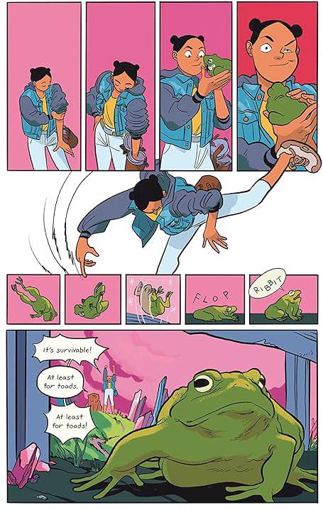 En lo visual, la historieta brilla gracias al trazo fresco y expresivo de Henderson. Su estilo, dinámico y lleno de personalidad, le da forma a un mundo mutante sin perder claridad narrativa. Cada escenario —desde ruinas cubiertas de magia hasta bosques que respiran como criaturas vivas— está construido con una atención especial al color y al movimiento. Las expresiones exageradas, los diseños creativos de seres mágicos y la manera en que las viñetas se abren paso entre escenas de acción frenética aportan una energía constante que contrasta con los momentos más emocionales. Henderson entiende perfectamente el tono humorístico y afectivo del guion, y lo potencia con un lenguaje gráfico que nunca deja de sorprender.