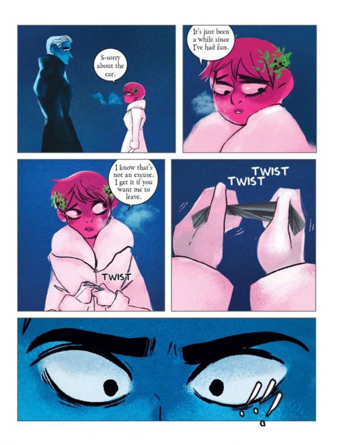En el plano visual se construye gran parte de la potencia emocional de la obra. Smythe utiliza una paleta de colores muy marcada -rosas intensos para Perséfone, azules profundos para Hades- y composiciones que priorizan la expresividad de los gestos y las atmósferas. El uso del color y del espacio no es solo estético: muchas escenas relacionadas con el trauma y sus consecuencias se narran desde la fragmentación, la incomodidad o la distancia, reflejando la confusión y el aislamiento que atraviesa la protagonista.