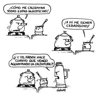 En las tiras de Severino, Galantz optó por ir a lo simple tanto en el trazo como en los chistes. No hay una reinvención de ninguna fórmula, ni nada jugado porque no lo necesita. En su mundo nos damos con versiones antropomórficas del set de mate básico: Pava, termo y por supuesto, el protagonista indiscutido: Severino mate. Con el pasar de las tiras llegan otros personajes, como Nina la rata, un personaje muy inquieto que rompe con la estática de los objetos inanimados y le da otra dinámica a la tira. Severino y sus amigos son personajes inocentes y muy simpaticones, que se vuelven el vehículo con el que el autor logra encontrar esos espacios de complicidad en todos los aspectos del ritual matero desde poner la yerba hasta el último cebado. Su presencia en la tira es tácita, pero inevitable. Estos personajes logran influenciar, casi siempre de manera positiva, a los que están a su alrededor y no se los ven. Unos mates para mejorar el ánimo, hacer sociales, compartir. Severino y sus amigos también la sufren cuando sus dueños se distraen viendo Netflix o incluso prometen el terror de todo mate: El edulcorante. Es en esta simpleza y complicidad que la tira logra llegar y hacer pasar un buen rato a los lectores. Instagram, por otro lado, es una plataforma ideal para que la gente conozca y comparta esas tiras que van a sacar sonrisas a más de uno. Después de todo, el mate es algo que miles y miles comparten.
