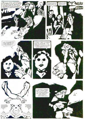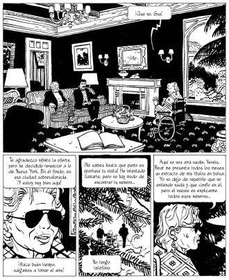 El dibujo es aún más cruel. Breccia entiende perfectamente el mensaje del guion y decide exaltar lo grotesco desde la fealdad y la deformidad. Sus juegos de luces y sombras y el minimalismo con el que construye los entornos, hacen que las páginas se conviertan en laberintos urbanos de los que los personajes no pueden escapar. Sus trazos hacen que la amoralidad se convierta en un monstruo tácito, que está escondido entre esos personajes caricaturescos y potencia con muchísima fuerza el guion.
