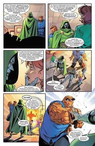 Gran parte de la magia del guionista está en su habilidad para introducir conceptos científicos con encanto nerd, que pasan a tener función narrativa y se vuelven parte importante de la trama. En Squirrel Girl, por ejemplo, es brillante su uso del lenguaje de programación para demostrarnos el egocentrismo de Doom. Esto es algo que viene como anillo al dedo en Fantastic Four, donde el amo de la verborragia científica se emociona explicando conceptos en ese lenguaje que no todos entienden, pero por alguna razón entretiene al público y hace que la lectura se vuelva interesante. Y por qué no, aprender algo nuevo. En “Whatever happened to the Fantastic Four?” hay dos momentos clave: el de las bacterias anaeróbicas y el concepto de espacios dimensionales. Son orgánicos a la trama, y el peso del conocimiento científico es clave para lograr superar esos peligros. Ahora sí, esto lleva a abusar de que Johnny y Ben se las pasen pidiendo que Reed “traduzca” esos conceptos al habla de los seres humanos corrientes. Una o dos veces está bien, pero el chiste se vuelve repetitivo y molesto. Es la única contra importante que hay en materia de guion.