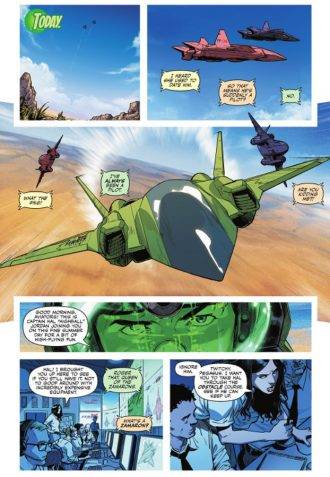 Ya de entrada hay un cambio de statu quo muy importante, cosa que podemos apreciar en “Green Lantern: Back in action”. El sector 2814 está aislado y Hal Jordan se encuentra en la Tierra sin posibilidades de volver al espacio. A pesar de vivir de forma austera y alejado de las aventuras, Adams se las arregla para traernos de vuelta a ese personaje carismático, seguro de sí mismo y totalmente descarado. Vuelve al tira y afloje eterno con Carol Ferris, que en cierta medida es una excusa para traer de vuelta uno de los elementos más interesantes del personaje: su faceta como piloto. Aquí hay muchísimos guiños a lo que fue Top Gun: Maverick. Gran parte de la acción se da en llevar al límite las posibilidades de los aviones y las tensiones narrativas propiamente dichas están centradas en las intrigas empresariales de Ferris Aircraft.