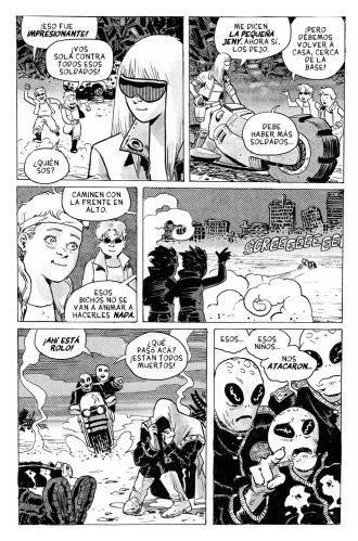 Los primeros capítulos de “Jeny y el post-mundo” son auto conclusivos. Historias de acción en la que ella se enfrenta a una que otra amenaza de turno y al invasor, que demuestra más patetismo que peligrosidad. Son bastante divertidos y dinámicos. A medida que avanza la trama, el autor comienza a tantear el origen de ese mundo y también nos trae de vuelta a su gran personaje, el pequeño Timy, aquí horriblemente mutado. Alrededor del octavo-noveno episodio comienza a haber una continuidad en la que profundiza el origen de ese post-mundo y también se anima a pequeñas saguitas de dos o tres capítulos como una en la que terminan luchando por sobrevivir en el espacio y en mundos alienígenas.