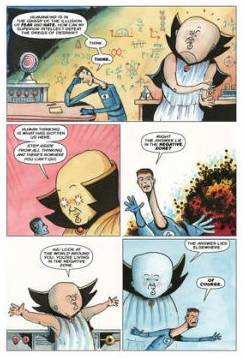 En ese collage de páginas clásicas, introduce de a poco sus propias viñetas, con reflexiones profundas sobre la naturaleza humana y muchas, muchísimas citas de figuras históricas. A mitad del libro, toma control total del dibujo y nos da un deleite de páginas ilustradas en su estilo tan particular, donde Reed Richards, guiado por The Watcher busca la solución a esa negatividad. Avanza con ese mensaje hermoso, que al mismo Mr. Fantastic le cuesta entender. Eventualmente todo se resuelve, y queda en claro que es una oda de amor al comic. Es una obra atípica, muy personal y muy llevadera, pero puede pecar de inocente e incluso, ingenua.