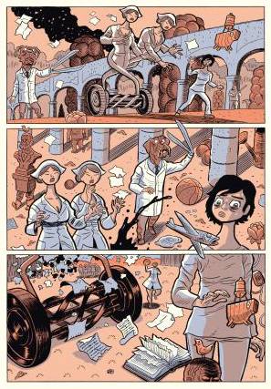 Esta dupla, que ya tiene otras obras en conjunto, son historietistas con mucha experiencia en el medio. Tienen recursos que les permiten moverse con la soltura suficiente para tergiversar a su gusto ciertos mecanismos narrativos, y lucirse cada uno en su área. La fórmula de Agrimbau consiste en tomar una patología X (claustrofobia, agnosia, etc) como excusa para jugar y redefinir elementos propios de la historieta como las viñetas, las onomatopeyas, etc.. Lo verdaderamente interesante es que no es un manual de estilo, ni una exploración dedicada exclusivamente a la semiótica del medio con una historia nueva en cada uno de los casos. Podríamos compararlo con 99 Ejercicios de Estilo de Matt Madden, de la que difiere justamente porque no es la misma página que se repite constantemente. Cada uno de estos relatos cortos tiene una historia interesante, muy divertida y con conflictos definidos. Estas historias atrapan porque en pocas viñetas definen el entorno y el género con el que trabajan, además empatizamos rápidamente con las protagonistas. Esto es algo muy complejo y difícil de lograr, y en estas historias fluye de manera natural. Si se puede criticar algo a nivel narrativo, es que Agrimbau se sostiene mucho en los diálogos internos de las protagonistas y esto le sirve para “explicar” lo que está sucediendo y cómo altera el entorno.