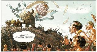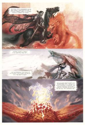 El problema de esta antología es que algunos dibujantes desentonan no sólo por su estilo, sino porque algunos nunca habían hecho historieta o quedan demasiado expuestos al lado de autores consagrados o con talento. La historia corta del huevo alquímico es un gran ejemplo, ya que muestra todos los defectos de Ciruelo como narrador y deja en evidencia que es sólo un ilustrador de dragones y fantasía. Lo peor es que luego de su historia corta, sigue la de Meglia (publicada acá en Fierro), un artista con una carrera más importante que la de Ciruelo en el mundo del comic, que es mejor historietista y encima su historia es una de las mejores del tomo. Otros autores que sufren el mismo problema son Granov, Riou, Vigouroux y Medellin.