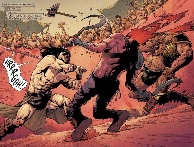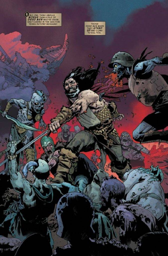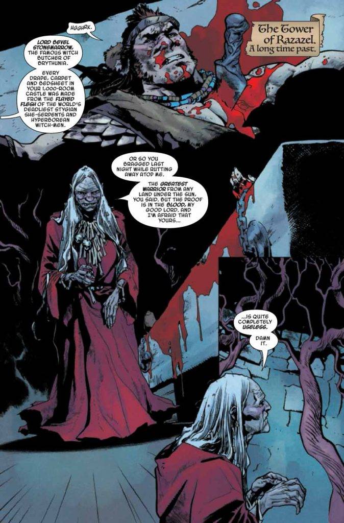La serie, de apenas 12 entregas publicadas regularmente hasta Enero del 2020, nos muestra pantallazos de distintos momentos de la vida de Conan, vida plagada de aventuras en los lugares más diversos que la “Era Hiboriana” tiene para ofrecer. Con gran oficio, Aaron construye en estas dos direcciones: por un lado nos muestra al temible bárbaro en distintas etapas de su vida, lo que le permite escribir distintas versiones del personaje (truquito que ya vimos en Thor) para poder construir, renovar y profundizar al protagonista, sin dejar de lado los elementos que funcionan como anclas de las características definitivas de Conan. Por el otro lado, el guion se luce en un paseo por un extensísimo mapa, donde las dotes del autor para la construcción de un mundo diverso, exotico, seductor, peligroso y sumamente violento. Narrativamente la historia, con sus saltos temporales y geográficos, parece estar presentada en capítulos con aventuras autoconclusivas, pero conectadas con una trama “macro” que se teje por detrás. Se trata de la Bruja Carmesí, quien junto a unos nenes macabros, aparecen una amenaza inmortal que acecha a Conan en cada etapa de la vida del héroe, en nombre de la deidad maligna Razazel. Estos 12 números de Conan, de acción trepidante y violencia descarnada, son ideales para los lectores que no tienen nociones previas del mundo del cimmerio, pero no descuida a los enciclopedistas nostálgicos, ya que como buen conocedor de la materia, Aaron deja guiños de experto a lo largo de la aventura.