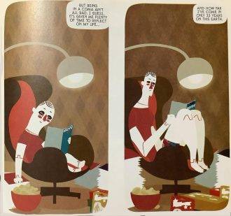 Una historieta de siete páginas, breve y atípica, en la que Aaron nos lleva a través de los bloques de texto a la mente de un hombre que está a punto de morir, conectado a varias máquinas que lo monitorean en lo que parece ser una sala de terapia intensiva de un hospital del futuro. Un muy lindo ejercicio de introspección, sin nada ni remotamente parecido a una aventura o un conflicto, en un registro que no suele verse en el comic yanki. El dibujo tampoco tiene nada que ver con ninguna de las tradiciones gráficas del comic norteamericano. El ilustrador portugués Miguel Alves lleva la faz visual al terreno de la ilustración o el siseño gráfico, en un estilo que recuerda a autores como Alberto Montt o Muriel Frega.