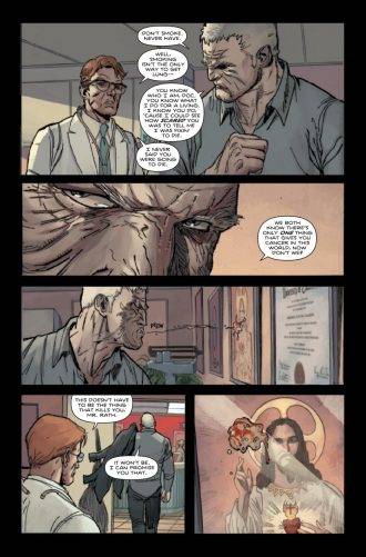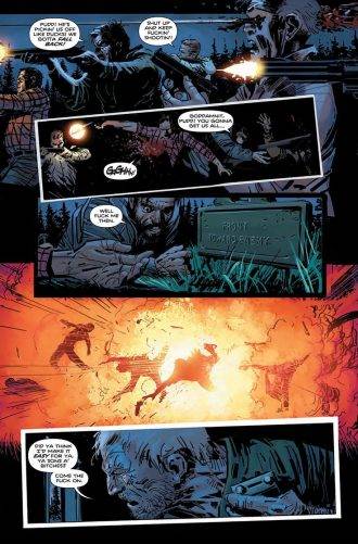El guion de cinco numeros a los que el autor denomina su historia más oscura, tranquilamente podría ser un arco de Southern Bastards. Se ocupa de llevarnos de paseo por el horror y la violencia más oscura (con un infanticidio incluido para ponernos en sintonía) mientras acompañamos a Ira en la cacería de su hijo y gracias a algunos flashback descubrimos la horrible tradición mortal de los Rath en cada generación. Por su parte podemos ver la determinación de Ruben, que a sabiendas de lo que es capaz su padre, y ante el inminente nacimiento de su bebé, decide no ser el boludo de siempre y, por lo menos intentar hacer algo digno. El tópico habitual que tanto le gusta a Aaron, el de la problemática de la relación padre/hijo, es llevado al extremo con un sadismo bestial, pero es ese mismo recurso lo que termina agregando valor y humanidad al devenir de Ira y Ruben.