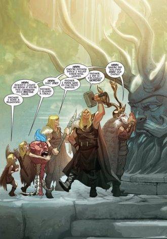 Los últimos números de la serie ya tienen todo el aire de despedida y no cuentan los sucesos de posguerra, esa estrategia tan característica de los autores en retirada de dejar todo acomodadito para su sucesor con un statu quo renovado para el protagonista: Thor reencontrado con su martillo, sin un ojo y con el título de All-Father, Loki en el trono de Laufey y Jane Foster convertida en Valkiria y en las puertas de su nueva serie.