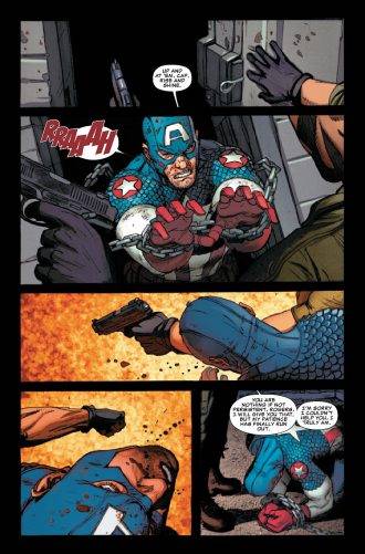 Con esa premisa, Aaron continúa los lineamientos del diseño de Steve Rogers que Mark Millar hiciera en la aclamada “The Ultimates” y consciente de que esa situación le da la ventaja de tener un Capi al que no necesita conectar mucho a la continuidad, el ídolo de Alabama exacerba los aspectos más nacionalistas del primer vengador. Los diálogos que esgrime Steve están escritos de tal forma que que su condición de “hombre fuera de su tiempo” sea evidente y subraya el hecho que Rogers ya era adulto en la década del ´40, entrenado (y educado) para un conflicto con una lógica que no será trasladable a ningún otro evento bélico del Siglo XX. Al salir del hielo en la actualidad, su mirada sobre el mundo, y sobre todo sobre la política exterior de Estados Unidos y sus instrumentos de ejecución será absolutamente conservadora y rancia sin cuestionarse una sola instrucción.
