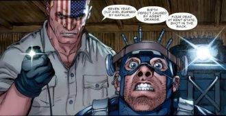 Este recurso de mostrarnos un Capi “a contramano” genera un contraste con Nuke quien, contra todo pronostico, es la voz critica y hasta arrepentida por las atrocidades que con regularidad comete la Casa Blanca en su rol de guardián inequívoco de valores universales como la libertad (desde una óptica blanca, occidental, cristiana y heterosexual, claramente). Esta “revisión” del accionar intervencionista de Estados Unidos tiene lugar durante el cautiverio al que es sometido Steve, durante el cual, entre tortura y tortura, Simpson le enrostra las chanchadas históricas (con data posta) del país y las administraciones que Rogers defiende incuestionablemente, en lo que sin dudas es el punto más alto de la historia. Y si bien de la boca para afuera el Capi no solo no se impresiona con el archivo negro de EEUU, sino que lo reconoce y lo justifica, en su interior hay un momento, mínimo, de cuestionamiento. Este conflicto se resuelve con un dispositivo narrativo que apela a lo metafísico/religioso y que al final pareciera justificar, de cierta forma, las acciones “non sanctas” del Capitán dentro de las viñetas, y de Washington fuera de ellas y darle un aspecto más emocional y/o humano a este Steve patotero, cabeza y border facho.