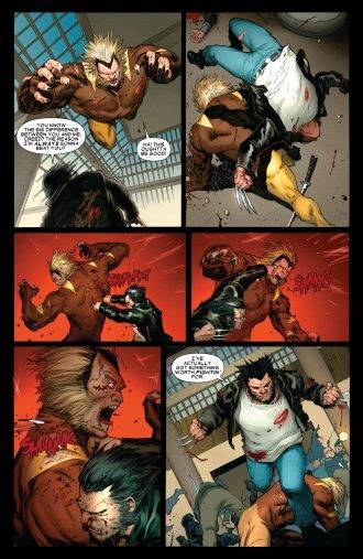 A lo largo de cinco años y más de 50 números, Jason Aaron buscó desde la pregunta “Quién/qué es Wolverine?” aportar a la construcción de uno de los personajes más importantes del género de superhéroes y para ello se hizo cargo de todo (o de la gran mayoría) el registro previa que había de Wolverine. Un registro tan grande como heterogéneo, pero en el que el escritor supo moverse con soltura gracias a su conocimiento del material y de su oficio. Al mismo tiempo, en lo que encuentro que son los grandes aciertos de Aaron y lo que le da valor agregado a su paso por Wolverine, llevó a cabo una humanización a través de relatos mundanos, increíbles en un personaje que vivió tantas cosas, pero que nos ayuda a conectar desde la intimidad. Como lectores, podemos reflejarnos en algunas de esas situaciones y ponernos al lado de un tipo que luchó contra imperios galácticos, vivió siglos, y soportó castigos indecibles (solo por mencionar alguna de sus infinitas gestas) pero al igual que nosotros, es vulnerable y sensible en el amor, disfruta ver un partido en un bar y se reconforta en el apoyo de sus amigos.