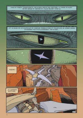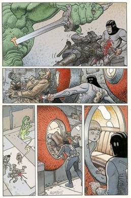 El guion es otro tema. Acá Moebius se resiste a dos tentaciones: por un lado, no regurgita ni respeta ni una puntita de los guiones que co-escribió con otra gente para la serie animada de Arzak hace 20 años. Por el otro lado, no nos hace el fan service a los que deliramos con las historias clásicas del personaje, las de los ´70. Ni siquiera se hace cargo de esa historia de los ´80 en la que explicaba quién era Arzak, cuál era su rol en el mundo y –de paso- integraba a la continuidad a los personajes de La Desviación, otra de sus míticas historietas setentosas.