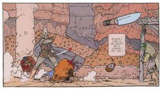 Si no entendés francés, medio que no importa, porque a nivel visual, Arzak: El Vigilante es un laburo realmente sublime, incluso para los propios standards de Moebius A simple vista puede parecer un trabajo frío, porque se nota que nada está librado al azar, ni una línea, ni una pinceladita de color, ni una onomatopeya. Sin embargo, en cuanto te enganchás con la narrativa y te empezás a meter en el mundo de Arzak, sentís que estos personajes están vivos, que laten, que de alguna manera te incluyen, te hacen partícipe de lo que está sucediendo. El Genio Infinito logra que vos, como lector, pases a formar parte de la maravilla que pone ante tus ojos. Esto hay que verlo para creerlo, no puedo armar un marco de referencia citando a autores cuyos estilos se dejan ver en la obra, porque Moebius es un universo aparte; a él no lo influyen, sino al revés: él es el que proyecta una sombra monstruosa sobre todos los que lo leímos alguna vez.