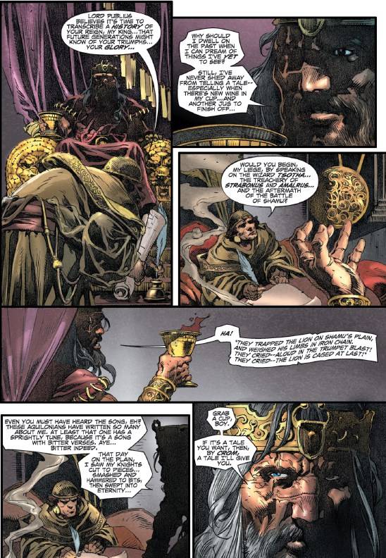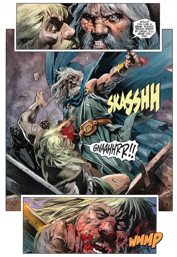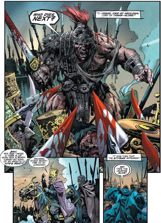 Y el dibujo de Giorello, ma-mita… Una bestialidad lo que dibuja nuestro compatriota en estas páginas. Tomás entregaba lápices sin entintar, tan complejos, tan sólidos, tan trabajados, que -photoshop mediante- se ven como si estuvieran entintados como los dioses. Sobre esos lápices, el colorista (nada menos que el gran José Villarrubia) no tenía más que añadir su propia magia, con unos resultados sublimes. El Conan de Giorello es enorme y exhuberante, y habita un mundo al que también se le aplican esos calificativos. Y el aporte de Villarrubia hace que todo sea vea aún más bello y más épico. Así da gusto bancar la monarquía.