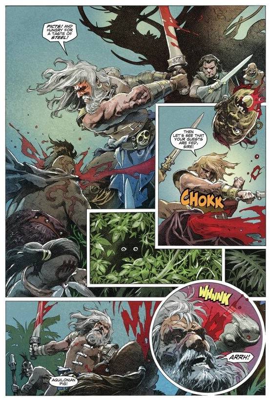 Lo importante es que sepas que si alguna vez te copás con Conan y te preguntás por dónde empezar a leer los comics del Cimmeriano, acá tenés una etapa realmente espectacular. Yo nunca fui muy especialista en Conan, pero creo que esta es la etapa que más me gustó de todas las que leí con este personaje. Me gusta que sea un cincuentón muy curtido, no tan impulsivo como en sus años mozos. Me gusta que para cuando matan a sus compañeros uno ya se encariñó con ellos… y lo que más me gusta: a diferencia del Conan de Roy Thomas, el clásico, el de los años ´70 en Marvel, este no está suavizado. La violencia es tremenda, la sangre te salpica, vuelan cabezas a la mierda… como debe ser un comic de bárbaros, no? Pero además hay diálogos muy logrados, hay cuerpos desnudos, hay gente que coge… Muchas cosas que en el Conan de Thomas no recuerdo haber visto nunca. Por ahí (repito) porque leí muy poco. Estos guiones de Truman está pensado para satisfacer a cualquier fan de la aventura. Hay locaciones exóticas, sacrificios, persecuciones, magia, combates a todo o nada, lindos toques de continuidad que hilvanan a la era de Conan con las de otros personajes de Howard, volantazos que no te ves venir… Realmente está todo muy bien pensado y bien cuidado.