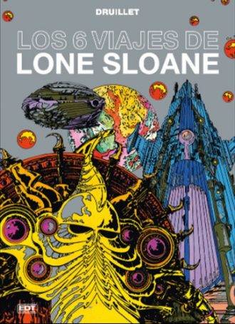 A fines de Mayo de 2013 (no hace taaaanto tiempo) se publicó en España un hermoso tomo de 72 páginas en tapa dura, llamado Los 6 Viajes de Lone Sloane. Valía 20 euros y recopilaba, como su nombre lo indica seis aventuras de Lone Sloane, originalmente realizadas por el maestro francés Philippe Druillet para la revista Pilote, entre 1970 y 1971. Este material se había conocido en la Madre Patria en 1981, desparramado entre varios e los primeros números de la mítica revista Cimoc.