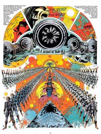 Esto no garantiza nada en materia de calidad, y la verdad que las historias de «Los 6 Viajes…» probablemente sean las más flojas en la extensa epopeya de Lone Sloane. Druillet las escribió con solo 26 años, cuando todavía le quedaba un largo trecho por recorrer hasta alcanzar su pico como autor de comics. Y claro, llaman la atención por el impacto visual porque en 1970 ya era evidente que estábamos ante un genio vanguardista único, un tipo que más que un autor es un tsunami irrefrenable de talento al que la industria jamás logró domesticar. En esta primera etapa, antes de pulir del todo su estilo, Druillet exhibía una fuerte influencia de Jack Kirby en la forma de dibujar los personajes, pero por suerte no dedicó su vida a la mímica del Rey, sino que tomó aquello que le servía (violencia a gran escala, onomatopeyas grandilocuentes, narrativa estridente) y lo incorporó a una estética personal, tan reconocible como desaforada, basada en esos diseños de locaciones, naves y vestimenta que combinan grandilocuencia con horror, y con detalles tan minuciosos que sólo un demente podría lograr.