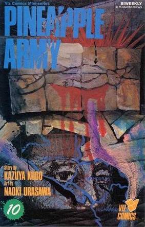 ¿Y qué onda en EEUU? En 1988, la siempre pionera editorial Viz apostó por una edición en inglés de Pineapple Army del modo más bizarro que te puedas imaginar: salió en tamaño comic-book, en entregas de 32 páginas, con periodicidad quincenal y con unas portadas muy raras, de un ilustrador llamado Darren Ching, que flasheaba Dave McKean y le trajo a la edición yanki una estética que no tenía nada que ver con la de Urasawa. Esta colección se canceló luego de apenas 10 entregas, que incluyen las mismas 10 historietas que publicaron Glénat y Planeta. Las revistitas aún hoy se consiguen en un rango de precio que va de los dos a los cinco dólares. En 1990, Viz reeditó los tres primeros comic-books en un TPB de 90 páginas, que incluye un epílogo de James D. Hudnall, el guionista fallecido hace pocos meses, quien tenía a su cargo la re-escritura en inglés de muchos de los mangas que publicaba Viz en los ´80 y ´90, y que además había combatido en Vietnam, en la Fuerza Aérea de los EEUU. Ese librito se consigue sin mayor dificultad: usado puede aparecer a partir de los u$ 8, y nuevo entre los u$ 26 y los u$ 56.