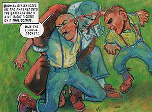 Milligan no buscó la historieta efectista, fácil y con el final predecible. Aún así logró un relato moderno y ambientado en la década de los ’70, que genera esperanza y locura en un medio tan repetido. Los diálogos, el registro del protagonista Martin ‘Atchet y su mundo, son una tarea compleja y extraña. ¿Cómo putean y hablan los skins? Nunca dudás del lenguaje urbano de calle y mugroso porque los insultos, el consumo de alcohol, las charlas que tienen y los problemas que afrontan son tan realistas, que todo ese mundo se te hace 100% creíble.