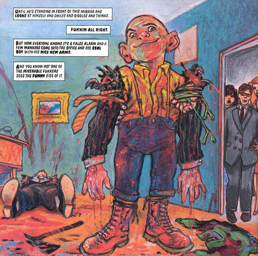 Milligan y Mccarthy son una dupla que durante la década de los ’80 y comienzos de los ’90, le regalaron al medio de los comics locura, oscuridad, punk, suciedad y ciencia ficción perturbadora. La historia de un skinhead víctima del fármaco talidomida, que tiene los brazos cortos y no puede ni masturbarse, es producto de la mente de ambos autores que lo introdujeron en una aventura oscura, sin esperanza y con soledad.