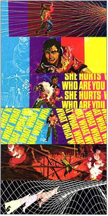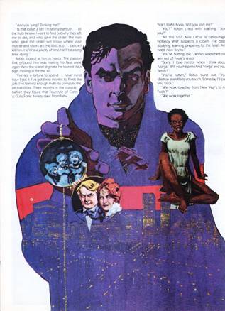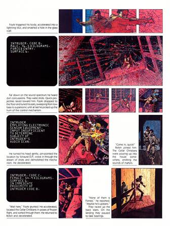 Ojo, no es una típica historieta. Hay narrativa secuencial, pero esta comparte las páginas con bloques de texto extraídos directamente de la novela de Bester. A veces las ilustraciones de Chaykin son sólo eso, ilustraciones, y a veces interactúan mucho más con los textos, se integran mejor, cuentan cosas que el texto no cuenta. La combinación entre ambas cosas está muy lograda y sin dudas, leer The Stars My Destination en esta versión es una experiencia muy distinta de la de leer la novela. El trabajo de Chaykin en la faz gráfica es monumental y se luce en los trajes, los decorados, las naves, las composiciones arriesgadas y sobre todo en los efectos loquísimos que logra con el color, en una época en la que todo se pintaba a mano. De todos modos, acá empieza un tibio coqueteo del autor con las computadoras… de fines de los ´70. Imaginate qué tipo de texturas se le podían incorporar a un dibujo como el de Chaykin con la tecnología de 1979, y casi te da ternura. Pero el ídolo estaba ahí, en la brecha, dispuesto a tirar magia y pelar vanguardismo con lo que había, fuera digital o analógico. El resultado es impactante, fascinante, de una belleza plástica muy, muy infrecuente.