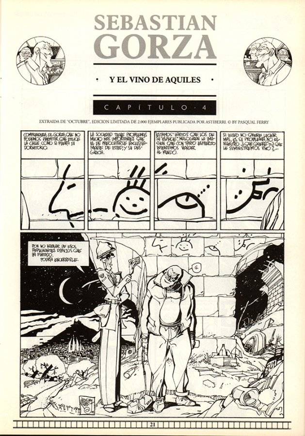 Si de casualidad conseguís hoy un ejemplar de Sebastián Gorza (o de Octubre, el libro editado en 2003 por Astiberri que reúne varias series realizadas en esta primera etapa por Ferry) te vas a encontrar con un comic que ni a palos parece estar hecho hace más de 35 años. Hay algo en esas historias, y en esa estética, que es atemporal, que no envejece, que conecta con el lector de la misma manera hoy que en 1989.