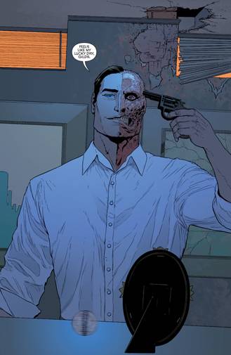 La semana pasada salió el n°28, en el que Batman compartió protagonismo con Two-Face y cuya última escena causó conmoción. En ella, Harvey Dent cazó un chumbo y se voló los sesos. «Era él, no tengan dudas -dice Tomasi- Ni un clon, ni un hermano gemelo, ni un impostor disfrazado. El que apretó el gatillo fue Dent y la sangre que salpicó al retrato de Gilda fue la de Dent».