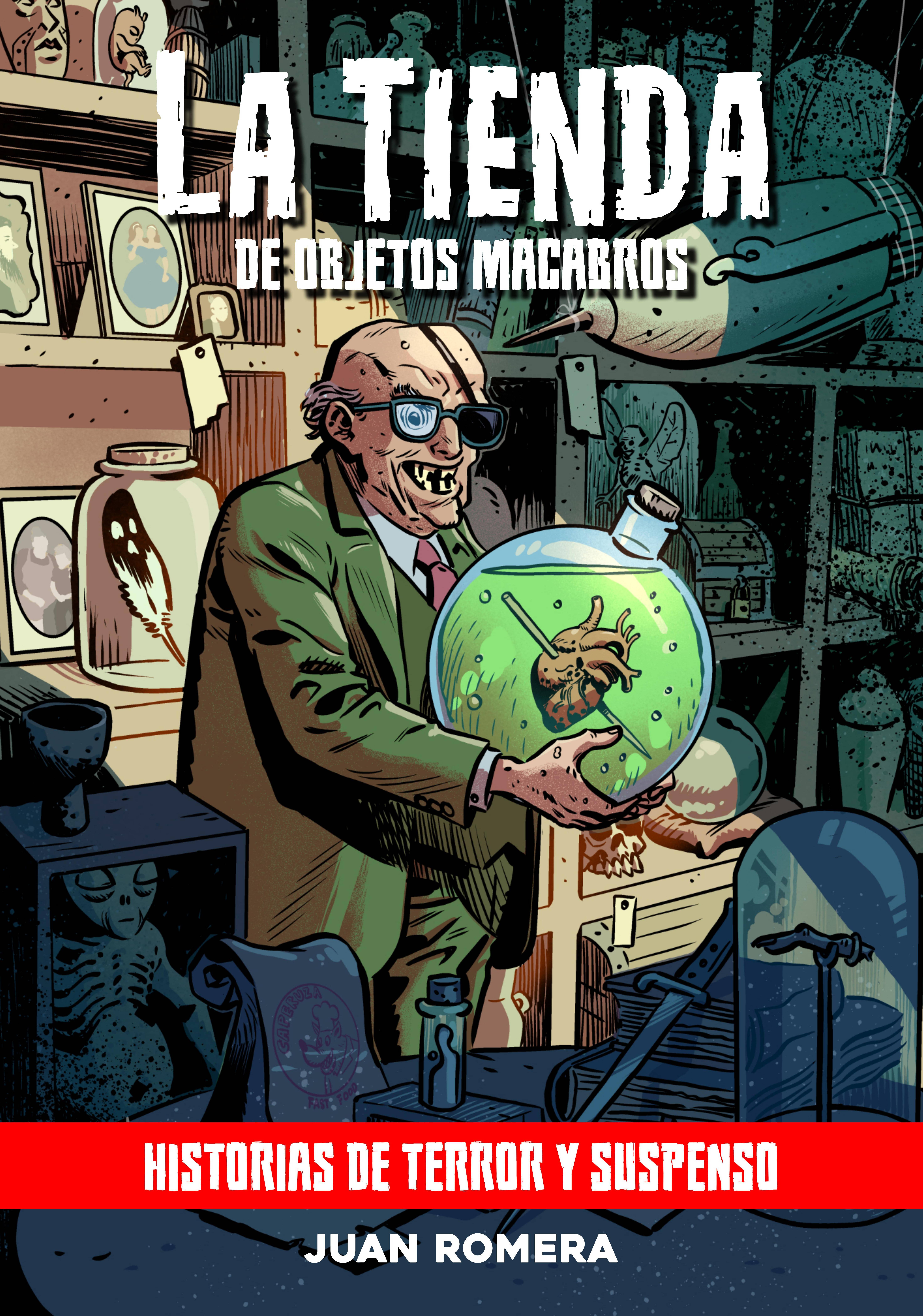 La Tienda de Objetos Macabros es un libro de 66 páginas en blanco y negro, que recopila varias historietas de terror y suspenso escritas y dibujadas por Juan Romera.