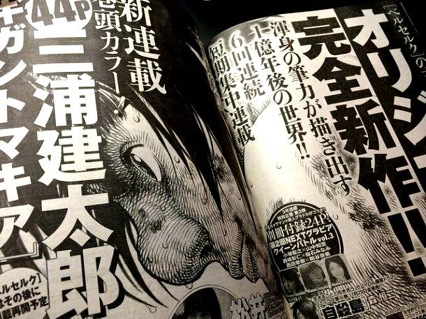 Este anuncio es muy llamativo, principalmente porque hace 20 años que el autor no dibuja otra cosa que no sea Berserk, su consagrada saga de fantasía épica. ¿Y qué sucederá con Berserk, se preguntarán los fans? Miura la congelará unos meses, hasta concluir Gigantomachia y promete retomarla en Marzo o Abril. ¿Terminarla? No, por ahora no está en los planes del mangaka darle cierre a la serie iniciada allá por Noviembre de 1990.