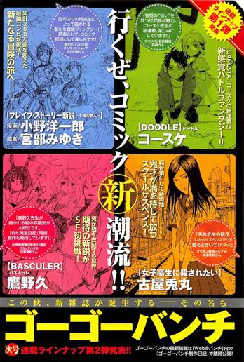 Para el otoño boreal, la editorial japonesa Shinchôsha planea el lanzamiento de Go Go Bunch, una nueva antología de manga, centrada en el género seinen (para lectores adultos). Todavía no se sabe con qué periodicidad saldrá la revista, pero ya están confirmadas algunas de las series que van a integrar el line-up original.