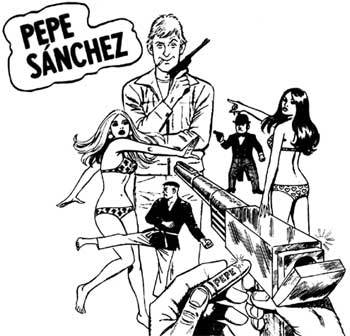 Las aventuras de Pepe son una parodia (“un homenaje, che”, diría él) de las de James Bond, en principio, y de las películas de artes marciales y de policías duros de los setenta. Así, tenemos los títulos “Operación Retrueno”, “De Rusia con amor… tadela”, “El satánico Doctor Sí”, “Goldedo”, “Operación Tragón”, “Con tacto en Francia” y “Pepe el Sucio”. También hay, a la manera de una historia extra, una “Información secreta sobre Pepe Sánchez” donde Vogt nos cuenta, en seis originales páginas originales, algunos turbios detalles de este personaje sencillo y magistral. Pepe zafa, igualmente, de ser una copia de los grandes espías o un simple tonto con suerte como el Superagente 86 porque tiene una personalidad propia, que le pertenece a él y sólo a él y que puede describirse casi exclusivamente con argentinismos: entrador, cheronca, bolú, ganador, fiera, gilún, piola, capo, copado, chanta, vivo, caradura, pintón… Como en aquella primera historieta de Inodoro Pereyra, en la que el gaucho de Fontanarrosa quería diferenciarse de Martín Fierro, Pepe logra ser él mismo sin proponérselo. La serie, que sigue algunos argumentos de los títulos que parodia, se presenta más bien como un what if…? que plantea cómo sería ese mundo tan exótico y fantaseado del espionaje visitado por un argentino típico, a veces asustadizo o valiente, vueltero pero autosuficiente, siempre despreocupado y algo ignorante (no sabe otras lenguas, ni cómo se escribe Estambul, ni cómo se pronuncia Fort Knox).